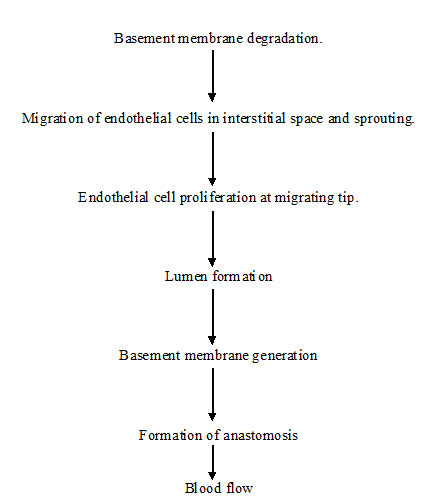 Vasculogenesis is a process in which blood vessels are assembled during embryonic development and further transformation of vascular net which proceed during angiogenesis, it is a complex multistep process where new vessels are formed from the pre-existing ones [3]. Steps in angiogenesis are shown in [Table/Fig-1].