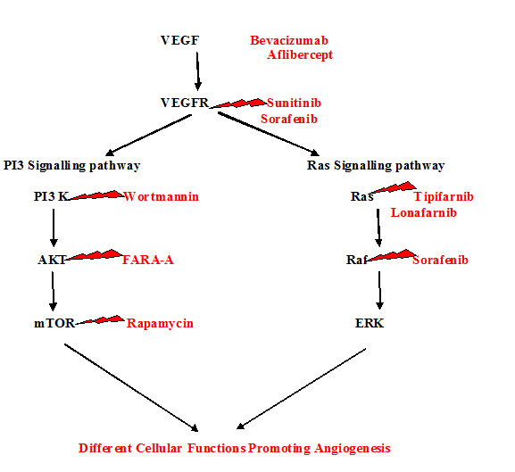 MAPK signalling can lead to increased angiogenesis, thus making it a logical target for Antiangiogenic therapy [48]. The drugs that inhibit MAPK signalling are Tipifarnib (R115777) [49] Lonafarnib (SCH66336) [50].