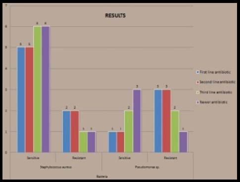 Staphylococcus were found to be most predominant out of which 20% were found to be resistant to penicillin and 1% were found to be resistant to erythromycin. These values were significantly less when compared to a previous studies done by Uwaezuoke et al., and Dwivedi et al., in which they found 95.8% and 48% samples resistant to penicillin respectively [17,21]. Second most predominant bacteria isolated was pseudomonas, most of its samples were found to be resistant to fluoroquinolones, which is in conjunction with a previous study done by Mac Dougall et al., [20]. When comparing the various generations of antibiotics 80% of the staphylococci were sensitive to all lines of antibiotics and only 10 % were found resistant to antibiotics in present study. 70% of pseudomonas was found to be resistant to first three lines of antibiotics although 73% samples exhibited sensitivity to the newer antibiotics.