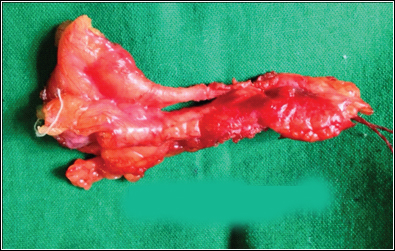 A 24-year old male, came to the Urology department, Lifeline hospital, with history of discharge from the umbilicus. On examination, it was detected as infected remant of urachus. Routine investigations were done. USG reported as ill defined hypoechoic tender tubular lesion underneath parietal wall in the midline infraumbilical region, suggestive of urachal sinus. MRI reported as findings of Urachal sinus extending for a distance of approximately 2.5 cm. A hypotense tract with narrow fluid filled lumen was extending from the umbilicus inferiorly for 2.5 cm approximately in length, beneath the anterior abdominal wall [Table/Fig-1] . No evidence of collection beneath the umbilicus. Urinary bladder had normal thickness. The patient was treated with antibiotics, and surgical excision [Table/Fig-2] of the urachus was done, and during the surgery, cystoscopy was also done. The physician examined for malignancy and found none. Histopathological report indicates chronic inflammatory disease. He was discharged with medications and was advised to do follow up. The patient had come for follow up after 2 weeks, then 4 weeks and then after 3 months and 6 months. He was examined and found no recurrence of the condition.