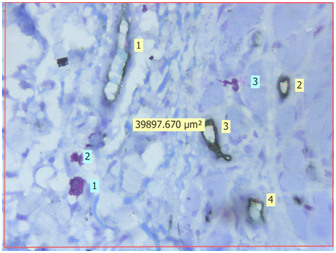 Light microscopic view of CD34 positive blood vessels and mast cells stained by Toluidine blue in normal oral mucosa (40X) {Light yellow labels shows number of CD34 positive blood vessels in the section, Light blue labels shows number of purple coloured mast cells in the section, The approx. 40,000μm2 is the area of the given section under 40X magnification}