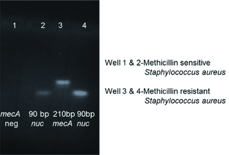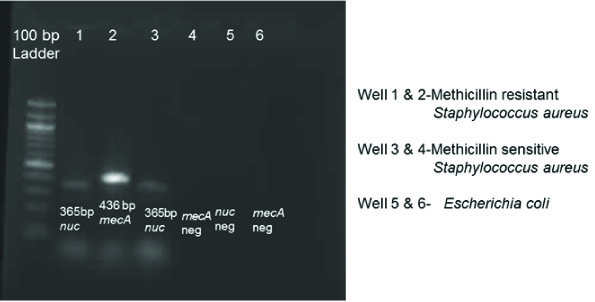 MRSA strains started emerging one year after the introduction of methicillin in clinical settings in 1960s [4]. The mecA gene, which encodes the low-affinity penicillin-binding protein 2a causes methicillin resistance in Staphylococci [5]. In recent times MRSA has emerged as an important pathogen of public health importance causing significant morbidity. Most of them are multidrug resistant. Rapid detection of MRSA is essential for early treatment of the patients and implementation of infection control policies to prevent its spread and outbreaks. The nuc gene is specific for S.aureus and molecular detection of this gene helps in the rapid identification of S.aureus from clinical specimens.