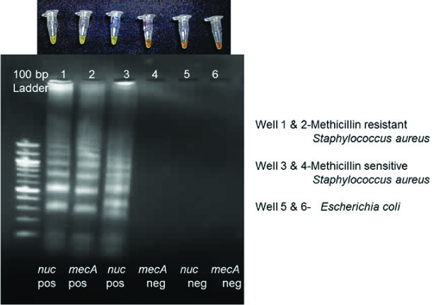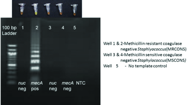 This study was conceptualized with an aim to develop and evaluate the LAMP assay for detection of Staphylococcal spp from cultures using nuc (for identification of S. aureus) and mecA (for detection of methicillin resistance) gene specific LAMP assays.