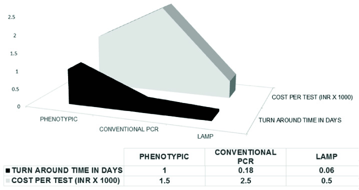 The comparison of TATs and cost per test of phenotypic, conventional PCR and LAMP assays are shown in [Table/Fig-6].