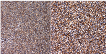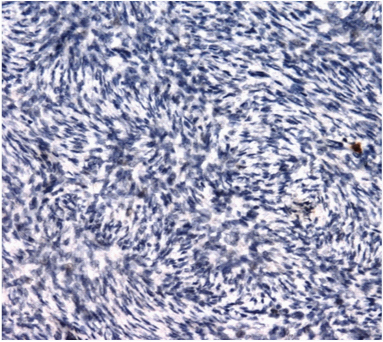 Photomicrograph showing tumour cells which are positive for vimentin (400X) and Cells showing low proliferative index (Ki 67 200X) respectively
