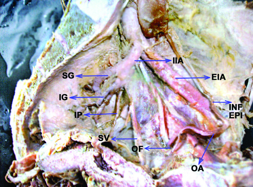 Out of 50 unilateral pelvises studied, 23 pelvic halves (46%) showed variations. In 11 (22%) cases, the origin of the OA was from the inferior epigastric artery. In 2 (4%) cases each, the origin of the obturator was from either the common stem of interal iliac artery or the external iliac artery. In 5 specimens (10%), the OA had its origin from the posterior trunk of the internal iliac artery. In another 3 specimens, the OA was seen arising from superior gluteal, inferior gluteal, and internal pudendal arteries. The present study was conducted on 50 random hemipelvises available in the Department of Anatomy. Therefore bilateral symmetry could not be assessed and the laterality of the pelvises was not considered. The observations are depicted in [Table/Fig-1,2,3,4,5,6,7 and 8].