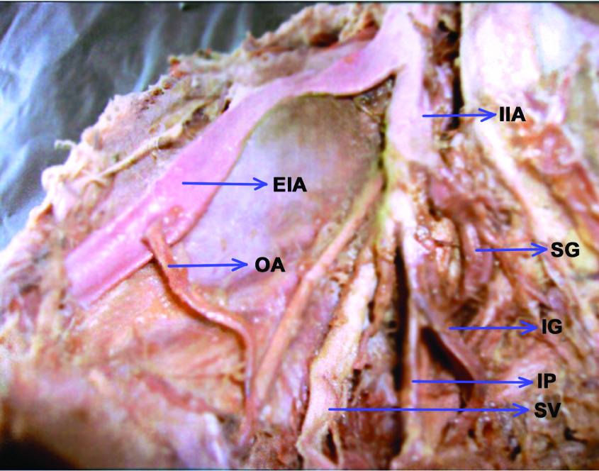 The internal iliac arteries provide nutrition to the pelvic wall, pelvic viscera, external genitalia, the perineum, buttocks and the medial part of the thigh. Distal collateral circulation may develop through connections between the deep femoral artery and the branches of the internal iliac arteries [5]. Hence a detailed knowledge of the vascular anatomy of pelvis is important for surgical interventions in this region.