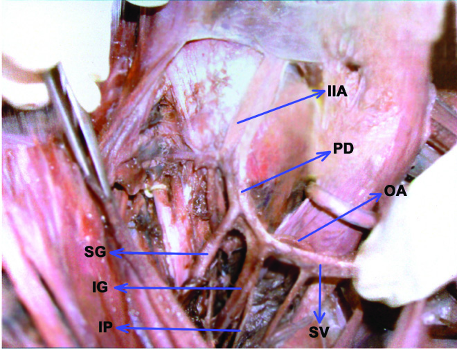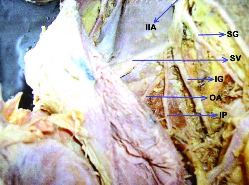 Among 50 specimens observed in this study, in 54% cases, the obturator artery arose from the anterior division. Braithwaite [8]. had dissected 167 specimens and noticed that in 41% (highest) it originated from the anterior division of internal iliac artery. However, he could not find even a single OA originating from the posterior division. Kumar and Rath [9] dissected 316 pelvises and reported a case in which the left OA was found to arise from the posterior division of the internal iliac artery. In the present study, in 5 specimens, the obturator artery was seen arising from the posterior trunk. The parietal branches of the OA are important collaterals in aorto-iliac and femoral arterial occlusive diseases. In cases of ischaemic necrosis of head of femur following decreased blood flow through OA, a possible bypass graft may be considered to connect the posterior division to the distal end of the obstruction [9]. The longer OA, due to its origin from the posterior division of the internal iliac, may present an additional advantage while grafting [10].