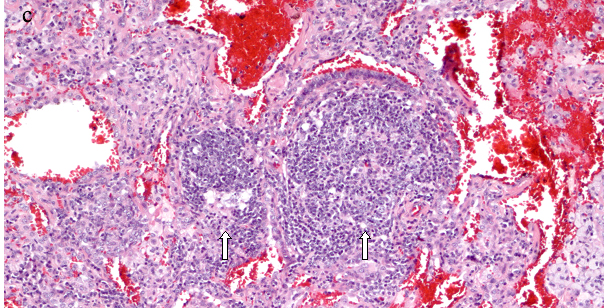 Studies in humans, however, show that BALT does not exist constitutively as a normal structural component of the airways, but rather an ectopic lymphoid tissue that develops in the lungs in response to antigenic stimulation through inflammation or infection, in a process known as “lymphoid-neogenesis” [6,7]. Once formed, BALT seems to persist in the lungs for up to 3 months after clearance of an infection. During pulmonary inflammation, the perivascular spaces become densely packed with lymphocytes, a process referred to as “perivascular cuffing”. Since pulmonary arteries run parallel to the small airways, lymphocytic inflammation may extend into the airways forming “Induced-BALT” [8].