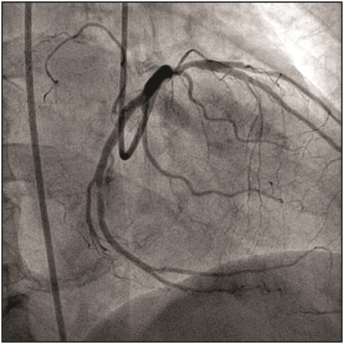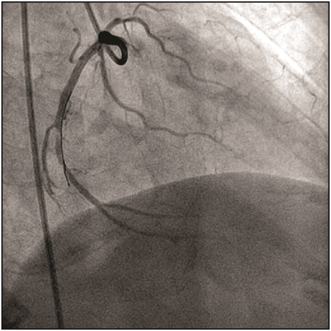 A 70-year-old hypertensive male patient presented to our institute with a history of inferior-wall myocardial infarction one month prior to the presentation. Despite the initial treatment for infarction received elsewhere, he was persistently experiencing effort angina of NYHA class III. Angiography was performed through femoral access, which revealed an insignificant lesion in proximal right coronary artery along with 80–90% stenosis in the left circumflex artery at the origin of left posterior descending artery. Patient was taken for angioplasty in the same sitting.