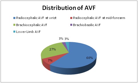 The most common site of AVF in our series was distal radio cephalic fistula, described initially in 1966 by Brescia, et al., [10]. High radio cephalic (mid forearm), brachio-cephalic and brachial-basilic AVFs were reserved for patients with previously failed distal AVF. This is line with K/DOQI guidelines to preserve proximal veseels for future use [2].