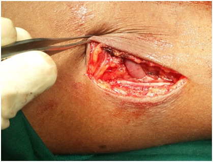 A total of 40 AVFs were created in 34 patients. Five patients required repeat procedure due to failure of previous fistula. Thirteen (32.5%) fistulas were done on right side and 26 (65%) were done on left side. Radio-cephalic AVF was the most common fistula followed by others as mentioned in [Table/Fig-2]. The various sites, artery and vein used for AVF creation in our patients are tabulated in [Table/Fig-3]. Lower limb AVF was created in one patient (2.5%) due to poor caliber of upper limb veins. End (vein) to side (artery) anastomosis was done in all cases [Table/Fig-4].