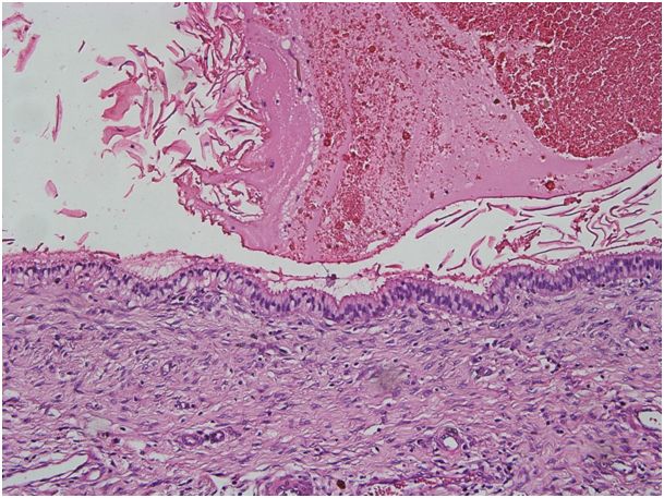 The vaginal cytologic examination was normal. We decided to excise persisting large sized cyst to exclude malignancy. We performed a total excision of the cyst under general anaesthesia. The diagnosis of nabothian cysts was done with the pathologic evaluation that showed retention cyst wall lined by ciliated columnar epithelium without atypia [Table/Fig-2] (H&E, 200X).