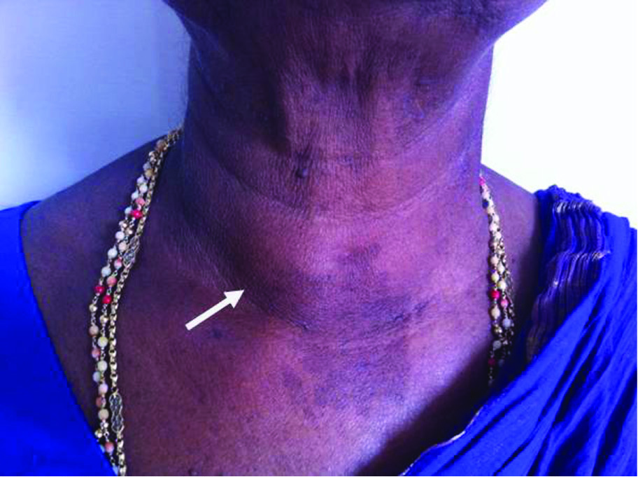 Clinical image of the patient showing nodule in the right side of the neck (shown in arrow)