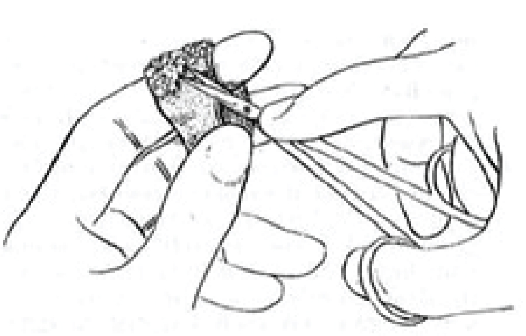 Placing the skin graft under tension over a convex surface is a prerequisite for optimal defattening. As originally described in text [3] and as per the conventional teaching, the FTSG has always been defattened by stretching it upside down over the tip of surgeon’s index finger of non dominant hand while cutting with a sharp scissors [Table/Fig-1] [3]. This may at times lead to inadequate or irregular defattening, may also cause buttonholing and may be quite time consuming for large area grafts.