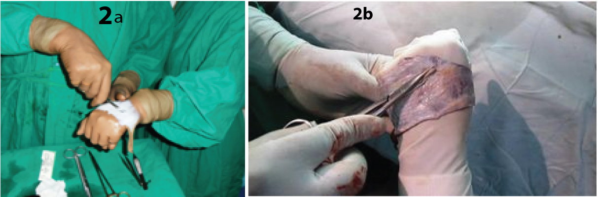 We have tried a novel way of defattening of a large FTSG by placing it over the dorsum of the non dominant hand of the assistant with dermal side facing upwards and defattening by using sharp scissors [Table/Fig-2a,b]. This technique has been particularly found useful for the large FTSG required for resurfacing of extensive facial post burn scars as the sheer size of the graft renders it unmanageable to defattening by conventional technique. Other advantages are that it is easier and faster and provides better outcome in terms of more uniform defattening of the FTSG and also prevents any inadvertent buttonholing of the precious graft. It is worth noting that this technique keeps both hands of the surgeon free to work.