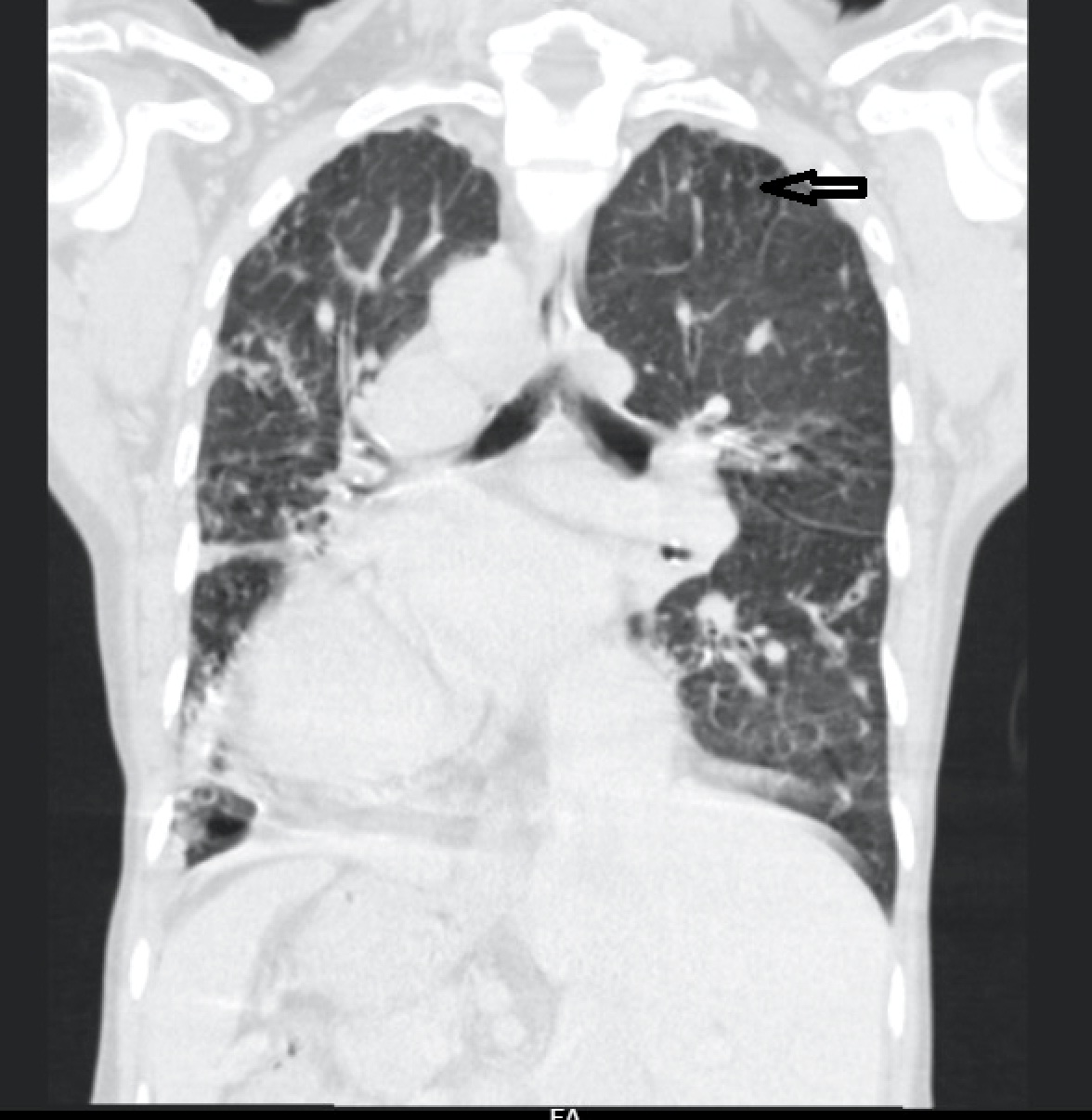For further evaluation, a contrast-enhanced CT scan of the thorax was done, which revealed varicose bronchiectasis involving the right middle lobe [Table/Fig-2,3] and lingular bronchiectasis of the left upper lobe [Table/Fig-4]. Brochoscopic alveolar lavage fluid was sent for analysis, which grew strains of Mycobacterium avium complex (MAC). A 2D ECHO was done, which showed evidence of severe pulmonary artery hypertension and gross tricuspid regurgitation, with good right ventricular function. Also, the patient was asked if she had the habit of voluntarily suppressing cough, to which her response was affirmative. She was a habitual cough suppressor, as a mechanism to prevent episodes of upper abdominal pain on recurrent cough episodes. With all these findings observed, we concluded that it was a case of ‘Lady Windermere Syndrome’. We started the patient on a 3-drug regimen (rifampicin, ethambutol and clarithromycin). After 2 months of follow up, the patient’s symptoms had slightly improved [Table/Fig-5].