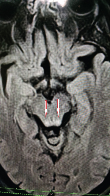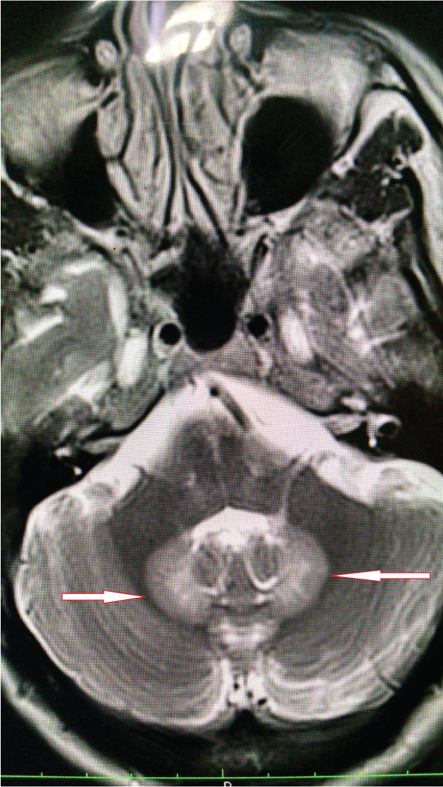 T2W axial image showing hyperintensity in bilateral dentate nuclei