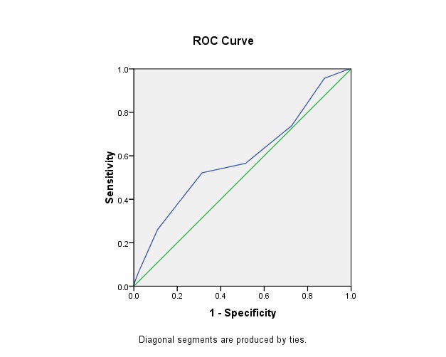 Receiver Operative Characteristic curve for determining the cut-off for IDRS-MDRF against gold-standard of Fasting plasma glucose (≥7.0mmol/L or 126 mg/dl and above): Area under the curve was 0.59; Cut off at optimum sensitivity and specificity was 60; Sensitivity and Specificity at this cut off of 60 were 52.2% and 68.6% respectively [Table/Fig-6].