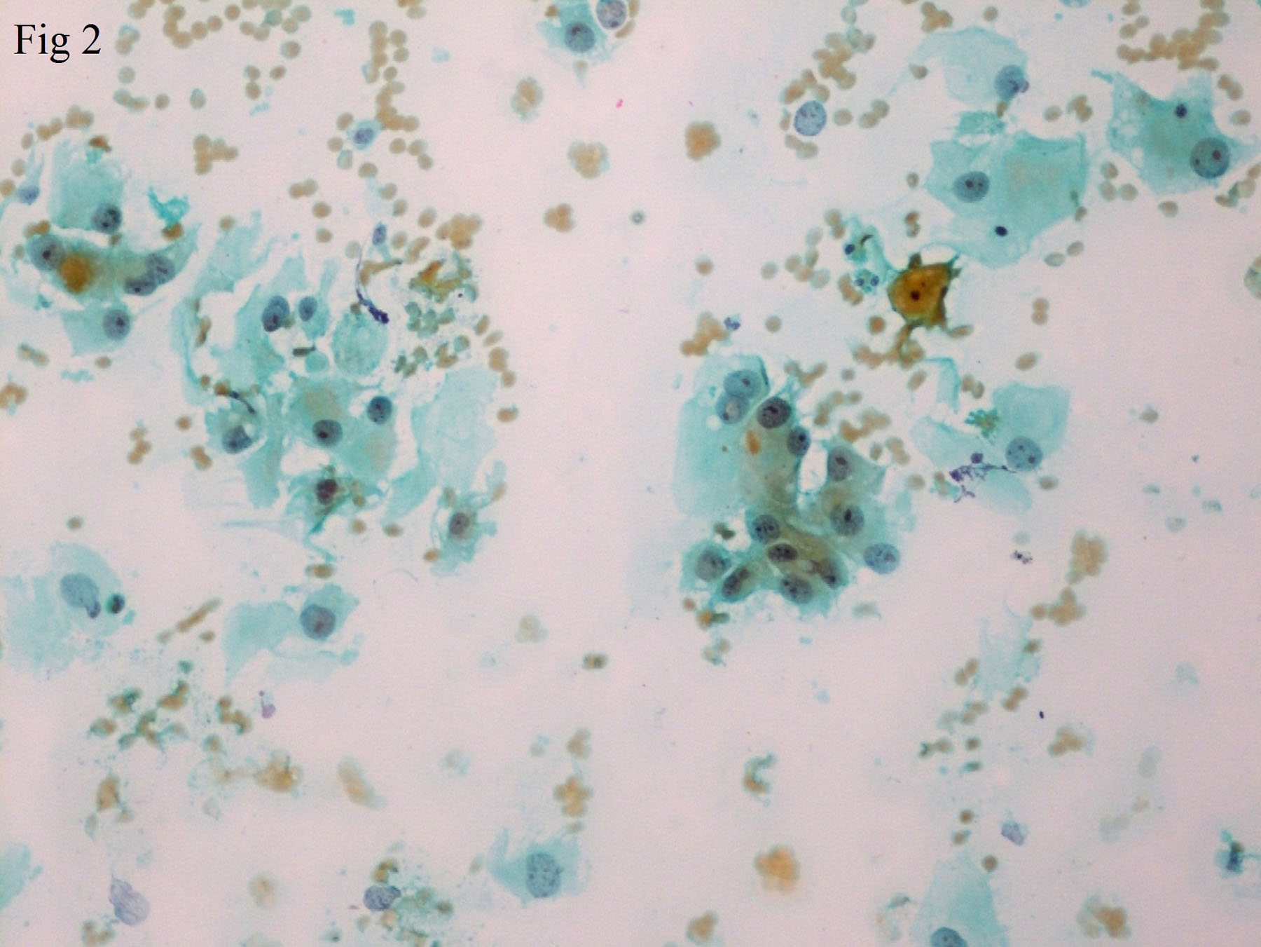 FNA smears showing clear cells with web-like cytoplasmic appearance, eccentric nuclei, prominent nucleoli, bare nuclei and a benign keratinized squamous epithelial cell. [Pap 200X].