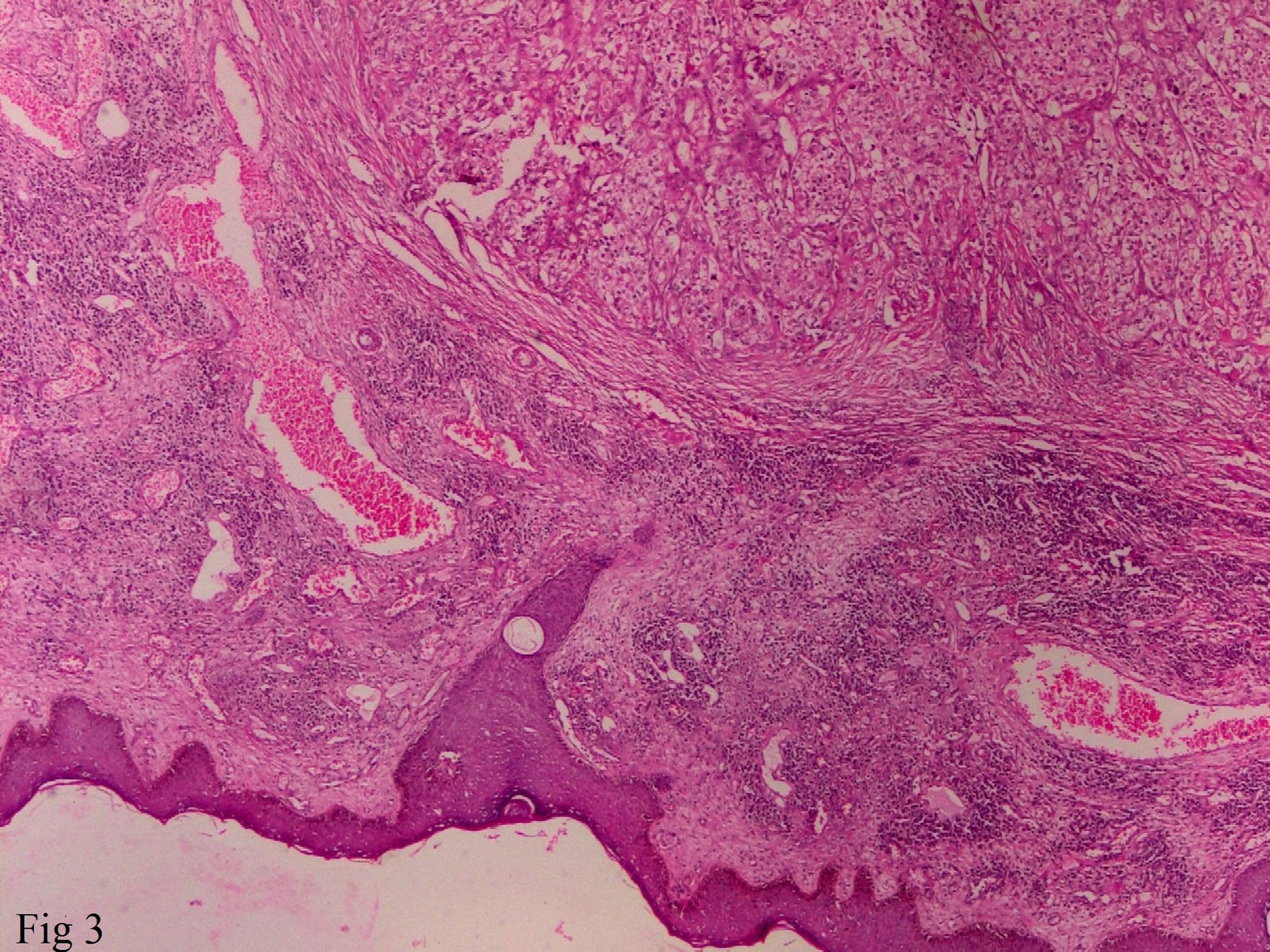 Histology showing stratified squamous epithelium of skin with underlying tumour composed of clear cell separated by fibrous septa and intervening blood vessels. [H&E 100X].