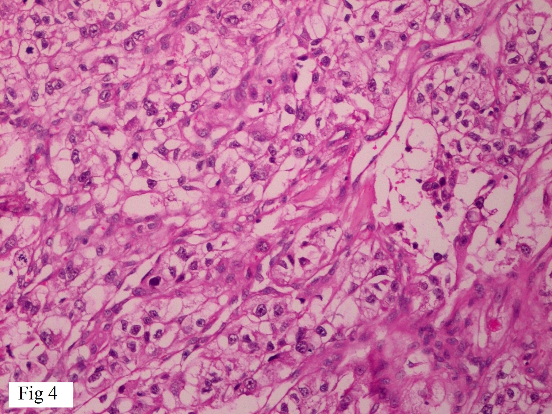 Higher power view showing clear cells of RCC. [H&E 400X].