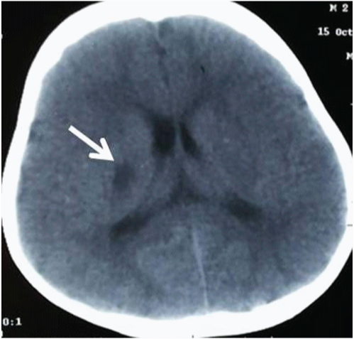 NECT SCAN – Fairly defined hypodense area in Right Capsulo-ganglionic region (White arrow)