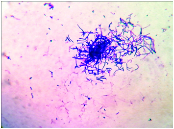 Photomicrograph of pleural fluid showing gram positive filamentous branching rods. (Gram’s stain, ×1000).