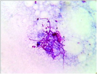 Thoracocentesis was performed after taking written consent from the patient and 600 ml straw coloured pleural fluid was drained. Pleural fluid adenosine deaminase was 210 IU/L. Pleural fluid cytology was negative for malignant cells. Gram stained smear of pleural fluid showed the presence of gram positive branching filamentous bacteria [Table/Fig-1]. Conventional Ziehl Neelsen staining for AFB was negative, however modified Ziehl Neelsen staining using 1% sulphuric acid showed acid fast branching filaments suggestive of Nocardia species [Table/Fig-2]. Blood agar and Sabouraud’s dextrose agar after 48 hours of incubation revealed dry whitish to tan colonies, which on further incubation showed the typical raised, chalky white dry colonies [Table/Fig-3]. Gram stained smear from the culture showed gram positive filamentous bacteria and modified Ziehl-Neelsen staining revealed acid fast filamentous bacteria. Presuming Nocardia, isolate was assigned to traditional grouping based on hydrolysis of casein, tyrosine, xanthine and hypoxanthine. Clearing of tyrosine and hypoxanthine crystals was observed after seven days of incubation indicating the isolate to be Nocardia brasiliensis. Patient was put on empirical antibiotic treatment with piperacillin and tazobactum. However, the patient succumbed before the specific treatment for Nocardia could be initiated.