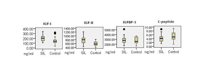 In conclusion, our data supports a potential role for elevated IGF-I, IGF-II and BEMR in pathogenesis of SIL. Circulating levels of IGFBP-3 and C-Peptide, though having a dynamic interaction with IGF-I and IGF-II, do not appear to have direct involvement in etiology of SIL.