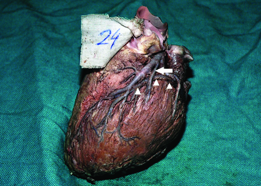 Coronary sinus traversed the left posterior part of the atrio-ventricular groove [Table/Fig-2]. Near its distal end it was observed to be deviated slightly superiorly to be related to the posterior aspect of the wall of left atrium. It opened in the wall of the right atrium, between the tricuspid opening and the opening of inferior vena cava, lying posterosuperior to the commissure between septal and posterior leaflet of the tricuspid valve. In 23 hearts CS crossed ventricular branches of circumflex artery superficially.