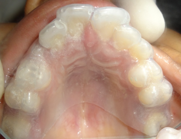 Parents reported to our college when the child was 7-and 8-year-old; her teeth were rounded off and mouth guard was given which later got damaged. At the age of 9 parents visited a local dental surgeon who extracted her deciduous teeth.