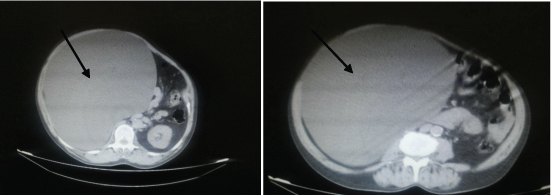 Abdominal CT showing an unilocular cystic mass filling the right hypochondrium, epigastric region causing displacement of right kidney.