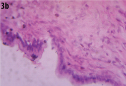 Gross examination showed an unilocular cystic lesion measuring 17 x 10 cm with a pale grey smooth cyst wall. [Table/Fig-2] of thickness that varied from 0.2 cm to 0.8 cm. On histology of the lesion showed a cyst wall internally lined by an epithelium of biliary type of columnar epithelium with focal pseudostratification and basally oriented nuclei with foci of apical mucin, no nuclear or cellular atypia and an underlying mesenchymal stroma that was resemblent of the ovarian stroma. Hence a diagnosis of biliary cystadenoma was offered [Table/Fig-3a,b] Immunohistochemistry of the tumour was positive for Cytokeratin in the epithelial cells [Table/Fig-4]. A final diagnosis of biliary cystadenoma was made.