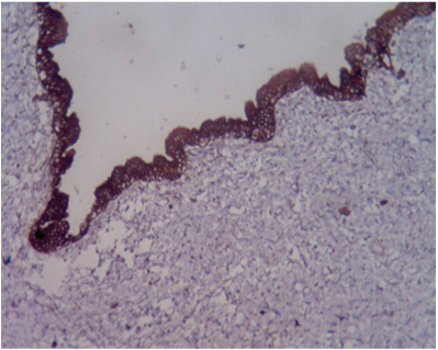 Photomicrograph showing cytokeratin positivity in epithelial cells.
