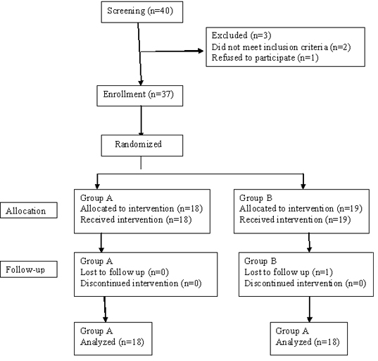 We encountered 40 patients who were duly screened. Of these 37 were enrolled in the study. Out of 37 patients, 18 patients were included in Group A (treated with metformin 1000 mg/ day and fenofibrate 160 mg/day) and 19 patients were included in Group B (treated with metformin 1000 mg/day and saroglitazar 4 mg/day). Of these 37 patients, 1 patient was lost due to follow up [Table/Fig-1]. Mean age of the patients was 58.1 and 62.6 years in Groups A and B respectively.