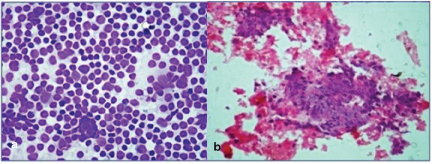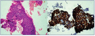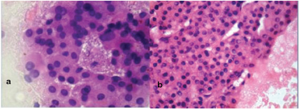 (b) Cell Block section show similar tumour cells. (H&E, 40X).
