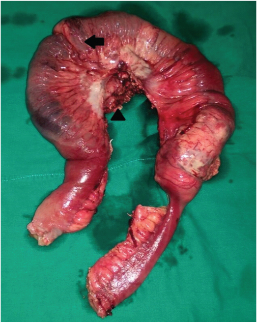 Resected surgical specimen. The specimen included 25 cm of ileum with intussusception (arrow) and lymph node mass (arrowhead).