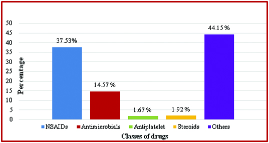 As seen in [Table/Fig-1] gastro-protective drugs were co-prescribed with different classes of drugs of which NSAIDs were the most common followed by antimicrobials. Other miscellaneous drugs found prescribed along with these gastro-protectants were multivitamins, haematinics, cough and cold remedies, enzyme preparations, etc.