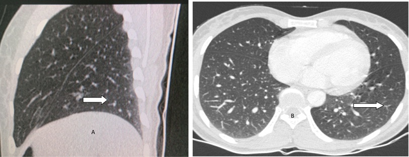 Magnetic resonance imaging (MRI) is considered superior to CT in detecting pulmonary endometriosis. MRI can detect the presence of blood and its products as hyper intense on T2-weighted spin-echo images during menstruation with increased uptake post contrast [10,11].