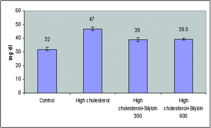 From [Table/Fig-1,2,3,4,5 and 6], it was observed that high cholesterol diet produced significant increase in (p<0.05) Total cholesterol, Triglycerides, VLDL-C, and LDL-C. High cholesterol diet also reduced HDL-Cholesterol significantly (p<0.05). Treatment with Silybin (300mg/kg) resulted in significant decrease of Total cholesterol (20%), Triglycerides (23%), VLDL-C (26%), and LDL-C (18%) and increase of HDL-C (3%). Silybin at 600mg/kg dose had resulted in further reduction in of Total cholesterol (24%), Triglycerides (27%), and LDL-C (24%). The effect of Silybin at 600mg/kg on the levels of VLDL-C and HDL-C was almost equal as that of Silybin at 300mg/kg.