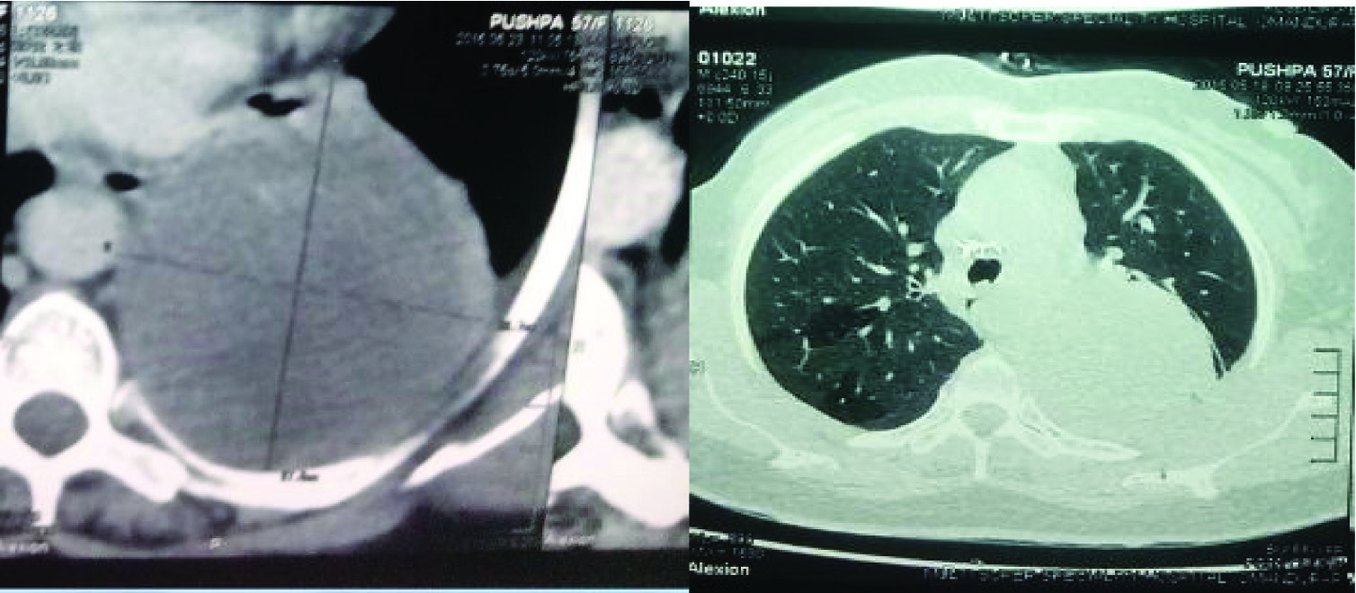 A 58-year-old post menopausal woman presented with complaints of dull aching pain in the posterior aspect of the chest wall for three months. Patient had past history of borderline phyllodes tumour of breast diagnosed on July 2009 and had undergone right mastectomy followed by chemotherapy and radiotherapy for which she was on follow-up till August 2013. Whole body bone scintigraphy done in August 2013 showed no evidence of bony metastasis. Patient was lost to follow up since then and was asymptomatic till three months before she reported to us. Chest X-ray [Table/Fig-1] revealed a well-defined homogenous opacity involving the left upper and mid zone. A small nodular opacity was noted in the right lower zone with absence of breast shadow. Computed Tomography thorax done revealed a large pleural based soft tissue density lesion extending from apicoposterior segment of the left upper lobe to superior basal segment of the left lower lobe [Table/Fig-2,3]. A nodule was also noted in the right lower lobe measuring 1.2 cm × 2.4 cm in the posterior basal segment of right lower lobe [Table/Fig-4]. Bronchoscopy revealed sluggish left vocal cord movements, distorted architecture of carina, and narrowed left upper lobe bronchus along with flattened and stretched bronchus of the lingular segment. The upper lobe bronchus could not be negotiated beyond the narrowing [Table/Fig-5,6]. All the above findings suggested the possibility of external compression of left upper lobe bronchus. Bronchoalveolar lavage sent for analysis revealed no evidence for malignancy or infection. Computed Tomography guided biopsy of the left sided mass lesion showed spindle cells with atypia in sheets and bundles on a myxoid stroma, delicate to broad collagen bundles with few dilated congested capillaries [Table/Fig-7]. No lung parenchyma was seen. Further immunohistochemistry staining was positive for vimentin, negative for ER (Estrogen Receptor), PR (progesterone receptor) & TTF (Thyroid transcription Factor). The Haematoxylin & Eosin staining, immunohistochemistry features were in favour of metastatic tumour. Clinical breast examination and mammography were normal. With the history of treated phyllodes tumour and confirmation by histopathological examination and immunohistochemistry we conclude that the mass present in the left side and the nodule of the right lower lobe as metastasis of the breast phyllodes tumour. After explaining the diagnosis and prognosis to the patient and their relatives, patient was started on chemotherapy under oncology care. Patient received six cycles of Paclitaxel, Epirubicin and cyclophosphamide with only partial response. Patient developed cardiac dysfunction, probably as a side effect of Epirubicin. So chemotherapy was withheld and patient is on symptomatic therapy at present.