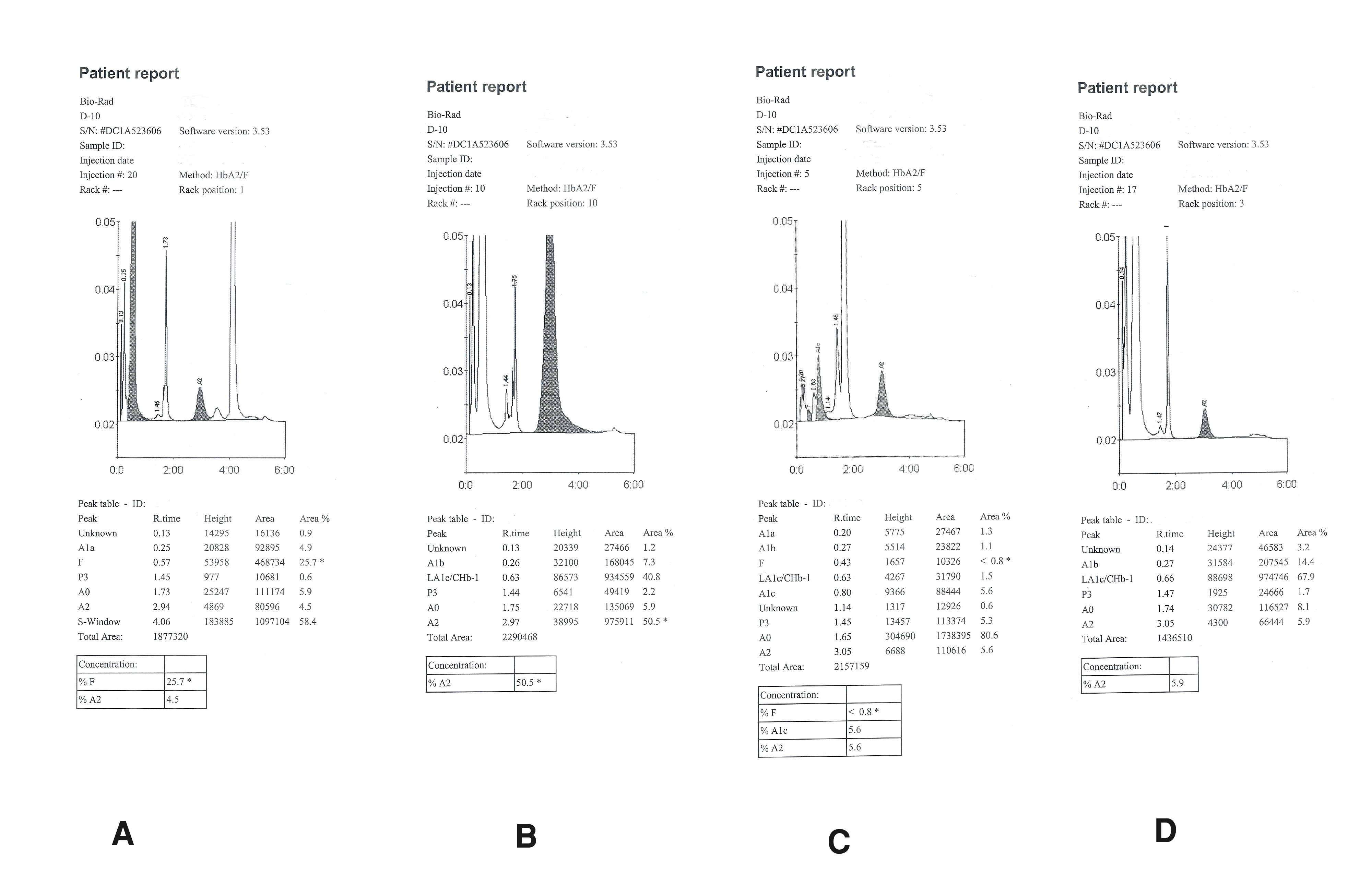 Chromatograms of the patients of: (a) Hb S/β-thalassaemia; (b) Hb E/β-thalassaemia; (c) β-thalassaemia trait; and (d) β-thalassaemia major detected during the study