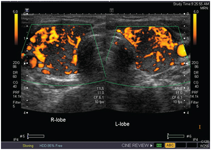 USG doppler image showing an increased internal vascularity in both lobes of the thyroid.