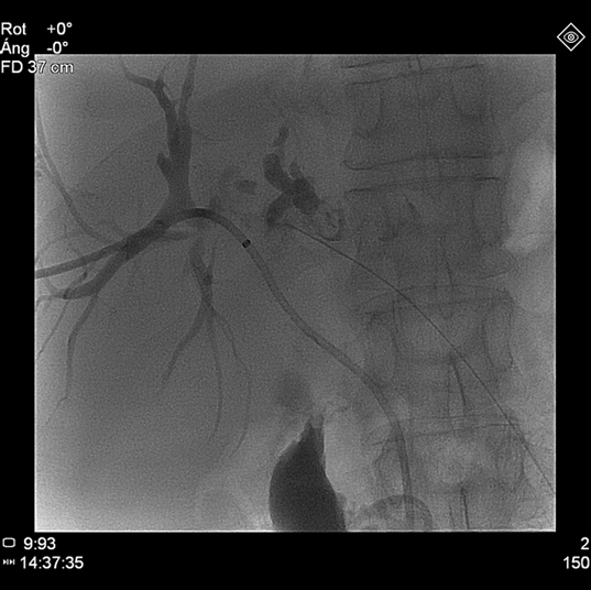 Despite an adequate biliary drainage, serum bilirubin levels were gradually increased. This was likely refractory to transhepatic drainage due to a mechanical limitation caused by the tumoural mold. Repeat cholangiography and new left biliary duct drain placement were achieved, but this measure failed to stabilize the situation. The patient subsequently developed a severe secondary biliary infection which evolved into septic shock. Despite antibiotic treatment, the patient died on the twentieth day of hospitalization.