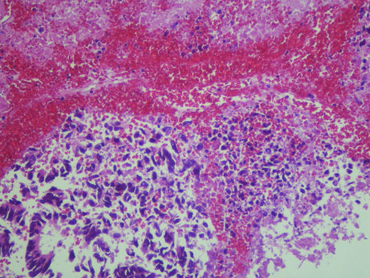 Histologic findings of the isolated biliary drainage solid fragments (HE stain). The histologic features were indicative of an adenocarcinoma. The liver and intrabile duct tumours resembled the colon carcinoma.