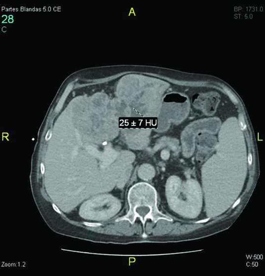 Percutaneous transhepatic cholangiography was then performed after ciprofloxacin prophylaxis. Internal-external drainage was placed during the intervention. During the procedure, solid material occupying the bile duct was unexpectedly identified [Table/Fig-1]. Pathological analysis demonstrated the presence of solid tumour fragments of adenocarcinoma [Table/Fig-2]. At this time, microbiological study of biliary fluid did not detect bacterial cholangitis. Given these findings, abdominal CT images were reviewed which revealed increased iodinated contrast uptake within the dilated bile duct, suggestive of bile duct tumour invasion [Table/Fig-3].