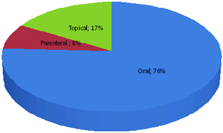 There were 200 (75.75%) combinations in oral dosage forms followed by 44 (16.66%) topical and 20 (7.57%) combinations in parenteral dosage forms [Table/Fig-3].