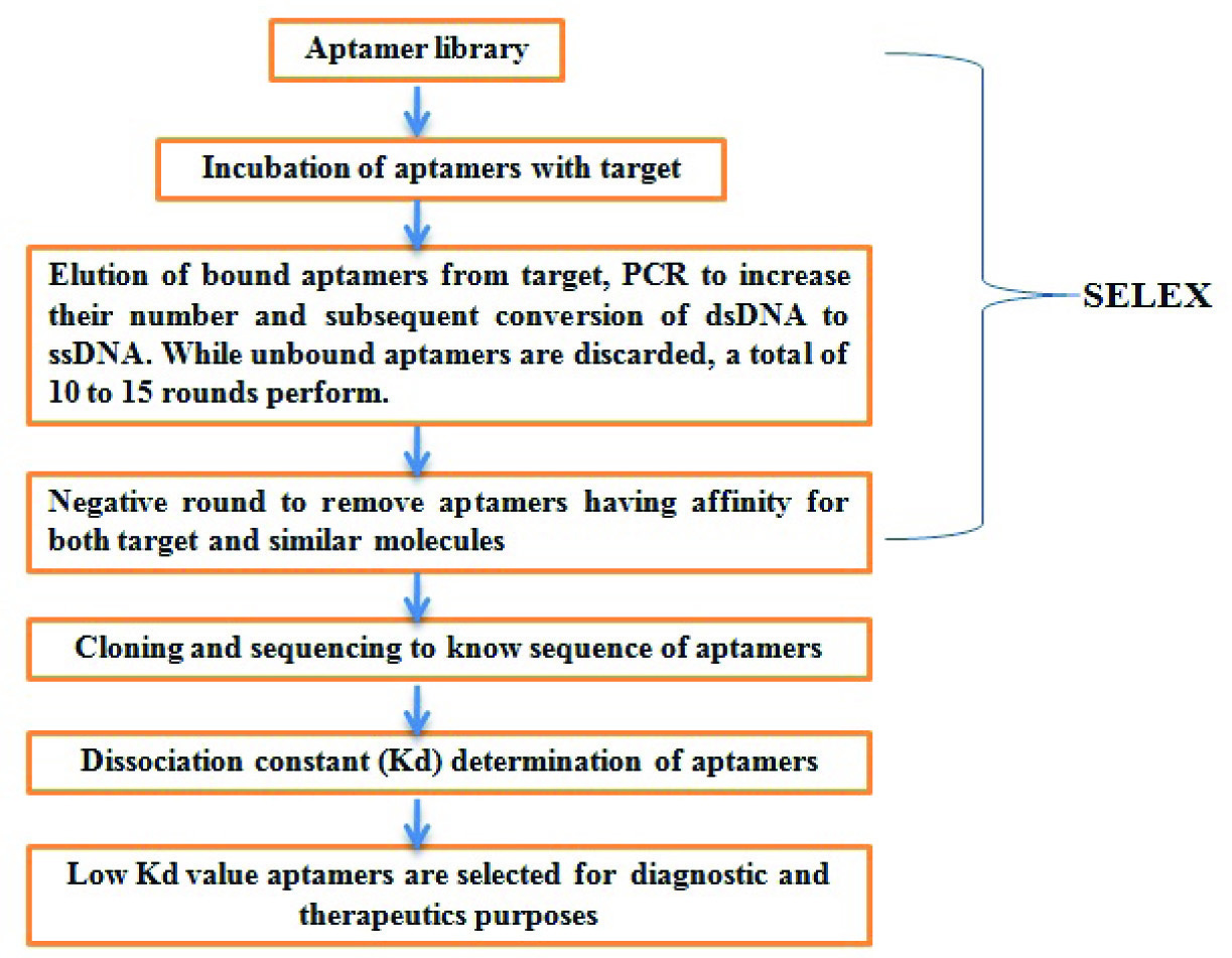 Aptamer are a new class of agents that can be used for both diagnostic and therapeutic purposes. They are synthetic single strand (ss) DNA or RNA molecules. They are selected against target molecules by an iterative process known as SELEX (Systematic Evolution of Ligands by Exponential Enrichment) [1], which was developed in 1990. Due to its various advantages, aptamers are regarded as promising alternatives to antibodies. Aptamers could be massively synthesized using in vitro techniques; its production is cost effective and animal free in nature. Aptamers bind specific ligands with high affinity and selectivity. They are more robust at elevated temperatures and thermal denaturation is reversible [2]. In last few years aptamers have been widely used in therapeutics. Macugen was the first FDA approved drug that was used against macular degeneracy disease [3]. Aptamers are also being devolved that can be used in clot buster, cancer therapy, autoantibodies, diabetes etc [3]. Companies such as NOXXON, Anisoma and other are doing cutting edge research on aptamers to be used as drug.