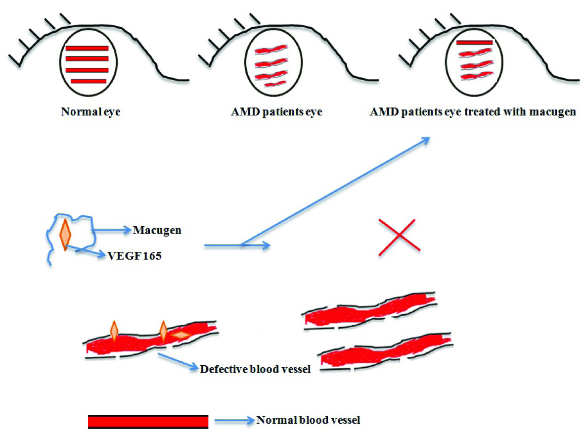 i) Macugen- It is an RNA aptamer that consists of 28 nucleotides and also known as pegaptanib. Macugen was the first FDA (in 2004) approved drug used in treatment of wet AMD (age-related macular degeneration) [14,15]. It was initially developed by NeXstar pharmaceuticals and in 2000 license was given to EyeTech Company (now OSI Pharmaceuticals) for late stage development and marketing in the United States. From outside of US it is marketed by Pfizer. Its molecular formula is C294H342F13N107Na28O188P28(C2H4O)2n, (n=900), M.W is 50 kDa and biological half time is 10 days. Macular degeneration is a disease of eyes where excessive leaky blood vessels are formed which causes blindness in patient if untreated. Macugen binds to 165 isoform of VEGF (Vascular Endothelial Growth Factor) and stops its interactions with VEGF receptors present on blood vessels in eyes [Table/Fig-3]. The anti-angiogenesis effect of aptamer not only stops the excessive growth of blood vessels, but also prevents the formation of defective blood vessels which ultimately reduces swelling in eyes. Pegaptanib is given by intravitreal injection into the eyes, more specifically, into the vitreous humour part of eyes [16]. Poly lactic-co-glycolic acid (PLGA) microsphere is used to encapsulate the drug for its release [17].
